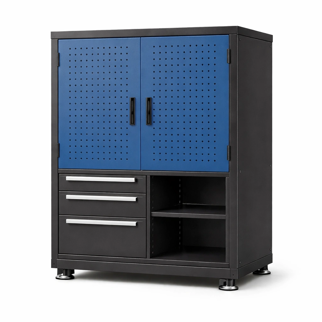 Dieser Metallschrank aus robustem Stahl verfügt über zwei perforierte Türen und drei Schubladen. Die offenen Fächer bieten zusätzlichen Stauraum. Der Schrank ist in Blau und Schwarz gehalten und hat eine Gesamthöhe von 120 cm, eine Breite von 90 cm und eine Tiefe von 45 cm. Die einstellbaren Füße sorgen für Stabilität auf unebenen Böden.